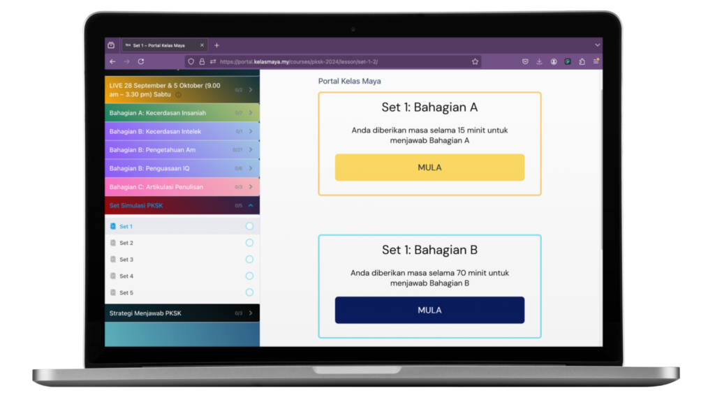 Setiap program mengandungi 5 set simulasi unik. Dapatkan 5, 10, atau 15 set! Simulasi adalah ujian berkomputer, berdasarkan format PKSK sebenar!